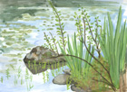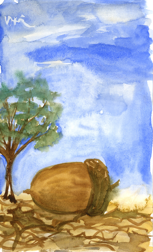 We went into the woods on a dark trail and came upon this little area on the lake. We had moss for our seating and pine branches as back rests. This is gouache. I think it might have been better as a watercolor. |