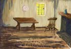 walking, then on a horse, to a stream and a cabin. This is the room inside