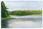 We went into the woods on a dark trail and came upon this little area on the lake. We had moss for our seating and pine branches as back rests. This is gouache. I think it might have been better as a watercolor. |